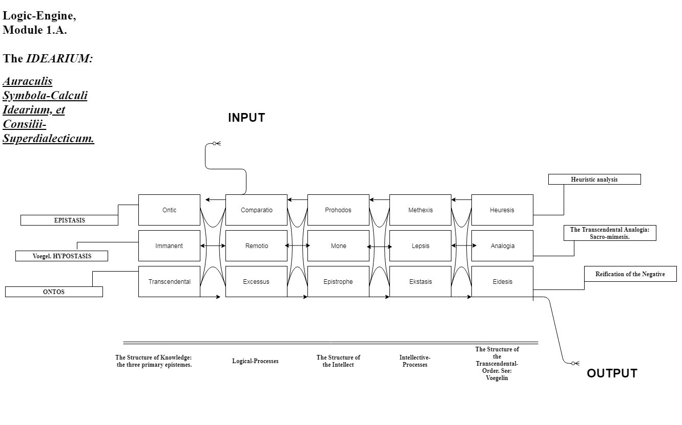 The procedural lattice of the Idearium itself, with its fifteen registers, (nine epistemic registers, and six logical operators) is an n-dimensional spatialization of n-dimensional time,- like the pantheatrum ad mysticis universum coeundi, [Bodin’s Colloquium Heptaplomeres de Rerum Sublimium Arcanis, drawing on the Latinized secretum of Raziel, depicted a grid of 1,296 boxes arranged in accordance to the elemental quaternity, each containing an animal, a metal, a flower and so on, from which the Creator could freely decompose and reassemble countless daughter-universes from a basic plan we would today recognize by the recombinant logic of a procedural matrix or an algorithm.] a matrix of potential interactions corresponding to the liminal non-state of the primordial ATOMOS, through whose event-horizon information falls sway to gravitational tyranny of the organo-psychic Return, that is, the death-drive, and is accordingly scrambled by the mutagenic proliferation of the metonym as a stochastic residuum of the pre-Symbolic Real within the circular construction-deconstruction-reconstruction of Ego from sinthome and vice versa, like particles of light drawn into the orbit of a black hole, and beyond whose un-pronounced Unity and impermeable event horizon the universe is decollapsed from the 2-dimensional hologrammatic image (the Ontos) of Part for Whole (the gnostic mythopoetic syndoche and syzygy) into new Multiplicity, allowing for the occulted truth of the Multiple,- of what was Lost, of the ‘Loss of Being’- the buried dream-wish of the Freudo-Lacanian Unconscious,- to return through the resonances of the emergent tetrapolar exchange in the Mallarmean dice-game with Chance, that is,- of the 2-d circularly inscribed field of discourse now projected into 3-d interactive-space by the Brunonian vertexes of ascent-descent, to thereby supplant the phallic-metonym representative of its insurmountable logic through the unforeseen,-- [contra the decomposition of binary ur-alternatives into coordinates within Cartesian-space in Weizsäcker’s thesis or the reductio-digital isomorphism of the Zusian ontology of information, the replicating syntheme of the generative-semiosis implies always the Alien-Third of the Piercian Triad, that is, an extrinsic datum by which the symmetry of the multiplicative function of the Dyad can be maintained across all levels of System, and without which the chiral-double would be conformed by the antidrome and consequently supplant the serial-logic and ultimate mandate of the value-exchange by the epi-lepsis and semantic-rupture of the incorporate asynthemate, rendering any attempt to negotiate the mimetic hyperinflation of the semiotic multiplier through symbolic-exchange quite impossible] that is, through the fourth-dimensional site of negotiation in which the Singular or MONE appears ((The Singular or Mone: chance; the unforeseen; the unrepeated and unrepeatable; unity emerging from multiplicity instead of the multiplicity absorbed into unity by the Plotinian MONON or the Freudian regression of the inorganic, the death-drive. Here we find the reversal of predicates involved in the mythic narrative structure of the chiasmus, which all of our myths and cosmogonies draw upon in order to produce out of a doubled perspective a kind of biocular focus,- a three-dimensional exterior in which to freely blend (this free replication is the essence of myth’s centuries of endurance and the manner in which it ‘spreads’ from culture to culture over time) the individual elements contained within the linear narrative structures employed by our myths, eg. from the ‘before the Fall, after the Fall’ holding together the dramatic framework of Genesis and the psychotypic puer-aeternus of the Garden [that is, neither the Child of Freudian narcissistic-regression, marred by the death-instinct, or of Jungian individuation, ennobled conversely by the dynamic potencies of life and the possibility of continued growth,- neither the Child before the emergence of the Man or the Child following a re-submergence within the preternatural experience of the germinal libidinalcharge unavusled by the imposition of the Real and not yet properly cathected, as characteristically mediated by the ascetic religious mode and interpreted as a transcendent ground of experience, the mythologon in which the afterlife is grasped as a ‘return to the womb’,- but the Child as what had always been excluded, like the very Self whose suppression allowed the search for the Self to begin,- which is truly that unrecognized Self.] all the way up to the matter-antimatter pairings that determined the ultimate fate of a baryonic universe. Here we recognize its most highly abstracted formulation: Unity before Multiplicity; Unity after Multiplicity: Mone and Monon. As Kunze points out in ‘Reverse Predication, a Review’, Zizek,- given his appropriation of the Deleuzian concept of demarcation,- [this is the basis of Deleuze’s writing on the philosophy of choreograpy, or any other discourse, vs. choreographing philosophy, that is, choreography as a parallel datum organized within the greater dialogia for which philosophy serves as a modus for the Deleuzian ‘concept-creation’ employable by any extraneous discourse] uses the reversal of predicates from symbolic-logic to formulate an interesting addition to the Lacanian framework, ie. the master-signifier, through which the ontogenesis of cause and effect is itself reversed, producing a magic looking-glass beyond which the Particular (as subject) reaches into the Universal (As the missing datum in the register of the real,- the locus of psychic horror prompted by the infantine resistance of the Real to the goading of the Wish. Note here Vico’s doctrine of the imaginative-universal and the assertion that the first human thought must have been a predicative-reversal in which the human subject recognized himself only within an attribution to which he was bo