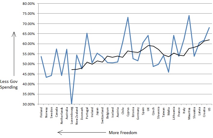 Good point! That’s true, but in this case socialism is a function of government spending and not the extent to which the people have control over the government. I can’t think of a way to quantify democracy. Can you? I’ll be more than happy to research it if you can.
