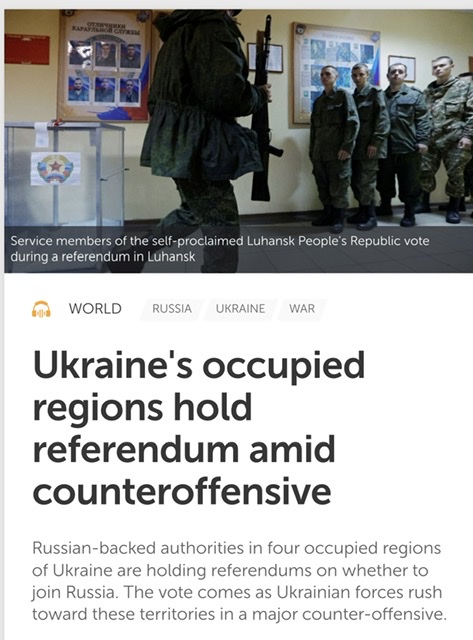 ‘Speaking to hundreds of Russian lawmakers and governors in a grand Kremlin hall, Mr. Putin said that the residents of the four regions — which are still partially controlled by Ukrainian forces — would become Russia’s citizens “forever.” He then held a signing ceremony with the Russian-installed heads of those regions to start the official annexation process, before clasping hands with them and chanting “Russia! Russia!”’[/b]