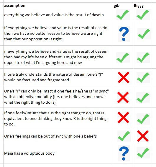 This is why I put a question mark in the chart above beside the statement “if everything we believe and value is the result of dasein then we have no better reason to believe we are right than that our opposition is right.” I’m not certain I agree with this. I mean, I get the point Biggy is making. We all feel certain about our strongest convictions, the one’s we’re willing to stand up for, to protest for; we all feel that the reasons backing up our convictions are logical and rock solid. This is no less true of our opposition than it is of our peers. So the feeling that our convictions must be true, rational, obvious, etc., is not a good indication that we are right. On the other hand, I don’t believe that all such convictions are equally (un)grounded. Obviously, some convictions are backed up with more justifications than others, with more evidence than others; some people have more and better sources for their convictions, based on more solid statistics and research than others, etc… In that sense, some convictions are more likely to be right than others.