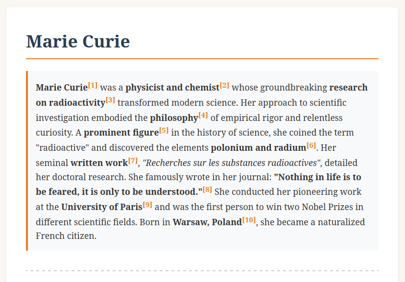 “Generate an entry describing Marie Curie. Output as a self-contained HTML document. Output in codeblock.”
