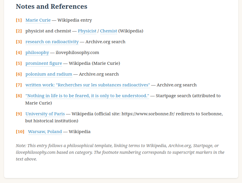 ⁷ “Our age is the age of criticism…” (Startpage search)This creates a self-contained, richly linked reference entry where every key term has both an inline link and a corresponding footnote with the same linking behavior.