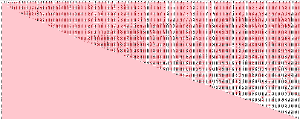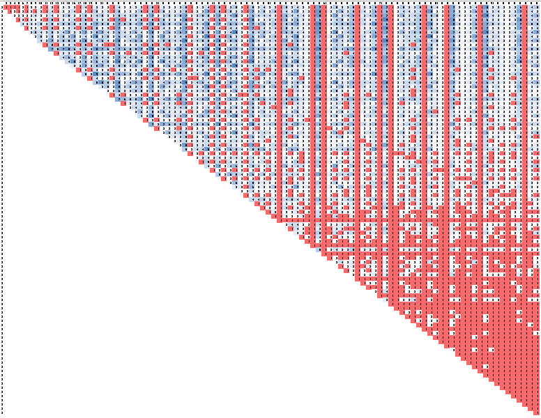 For any sum, there will be a diagonal line sloping up and right that has the same sum (because, e.g., 6+5 = 7+4 = 8+3 = 9+2 = 11). So in this chart, I was looking for the sloping lines that don’t contain unique values, i.e. that had no reds. This immediately eliminates everthing to the right of the solid red column around the middle of the chart (53xY): every diagonal line that extends beyond that column will have at least 1 unique product, and we need diagonal lines that have no unique products. There are relatively few lines, and we can take the list of sums corresponding to those lines: 11,17,23,27,35,37,41,47,53. We know the sum is one of those numbers.
