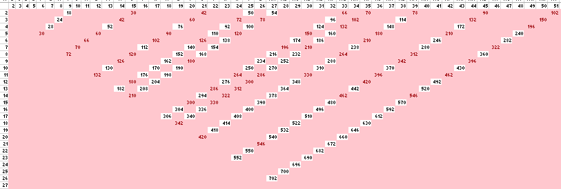 Finally, we look at Sarah’s last statement. Peter knows because his product is one of the values in white on the previous chart, that is, there is only one combination of numbers that falls along the diagonally sloping lines that has a product equal to the one he knows. This is enough to tell Sarah what number it is only if it is the only value in white with the sum she knows. And if we look along the diagonal lines, we see that 52, at the intersection of 4 and 13, is the only white number in its line (the line of numbers that sum to 17), and that no other line has such a number.