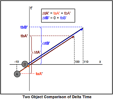 We do this for two objects A and B over the same time and distance interval but with different starting points, and we find that ∆tA’=∆tB’.