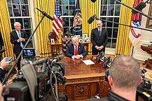 President Donald Trump signing Executive Orders, February 10, 2025, in the Oval Office. Navarro is standing behind Trump.