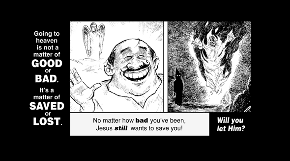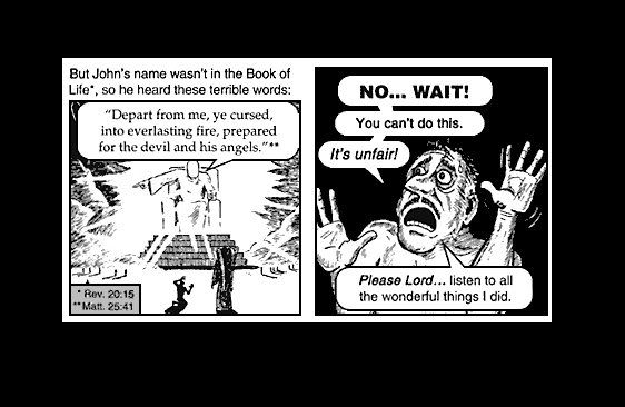 [b] The “Faith Through Works” doctrine holds that faith in the sacrifice of Jesus Christ and even God’s forgiveness of sins through this faith alone does not suffice for salvation. “Works” are required (good deeds, preaching of the gospel, the performance of miracles (?), etc.). However, a common staple of Fundamentalist teaching stresses the importance of human effort in the performance of these “works”–such that one must not rely solely upon God for one’s salvation but also upon oneself.