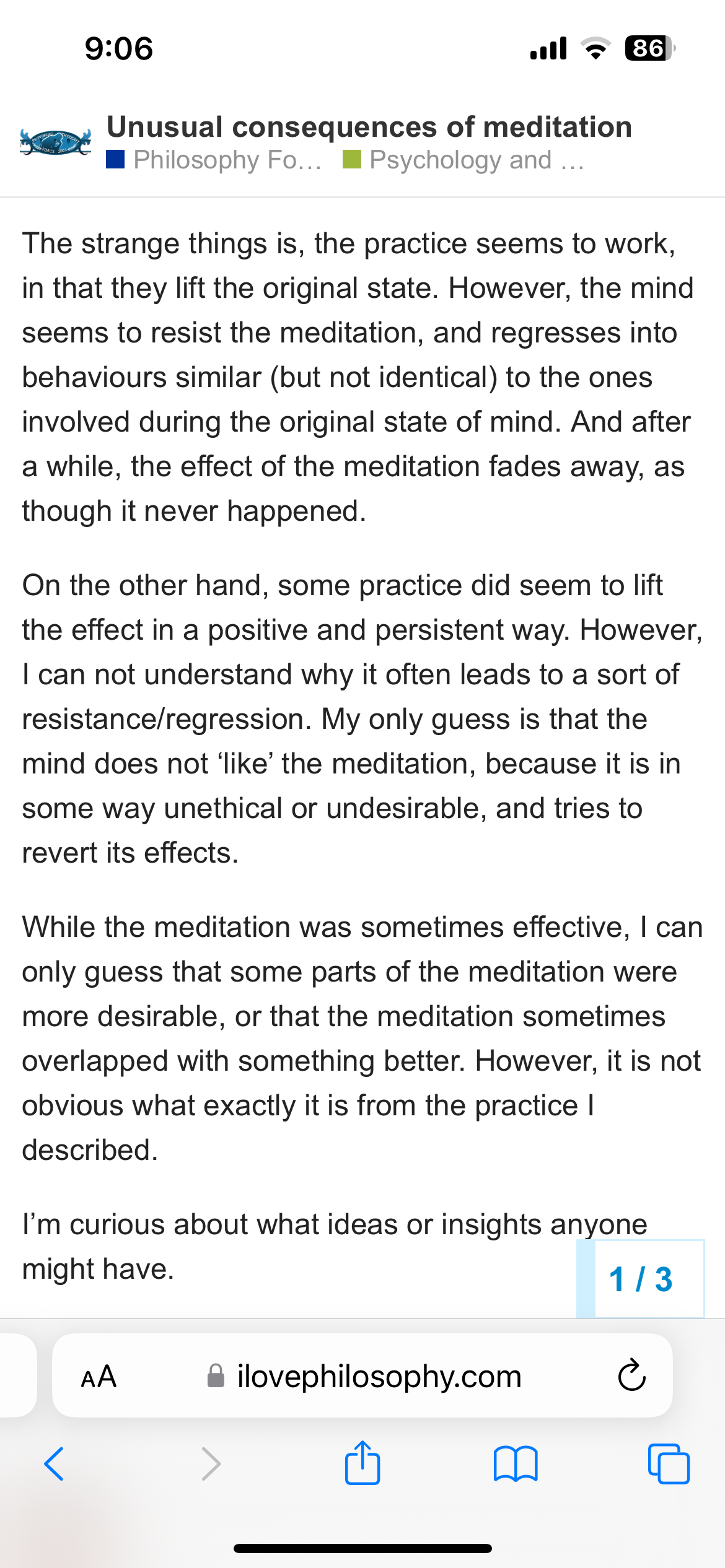 “On the other hand, some practice did seem to lift the effect in a positive and persistent way. However, I can not understand why it often leads to a sort of resistance/regression. My only guess is that the mind does not ‘like’ the meditation, because it is in some way unethical or undesirable, and tries to revert its effects.”