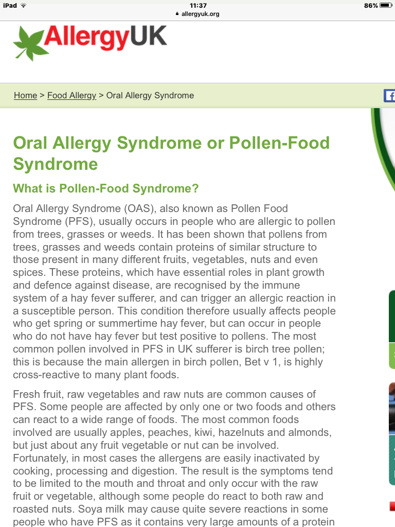 I am not actually intolerant/allergic to any foods themselves, but I am to certain proteins in foods that my body mistakes for allergens, which then produces histamine in me and causes the chain reaction of symptoms I display. My CF consultant called it an allergy⦠I have stopped eating most fruits because of this⦠because of Pollen Food Syndrome (PFS).
