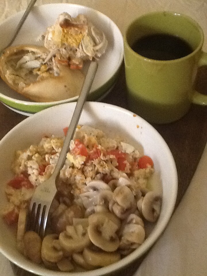 After yesterdays eating plan of coffee and roll-UP’s, brunch was most welcome this early-afternoon. I seem to be better able at digesting mushrooms ( organic… as per) as the ensuing days of severe cramps seems to have waned.