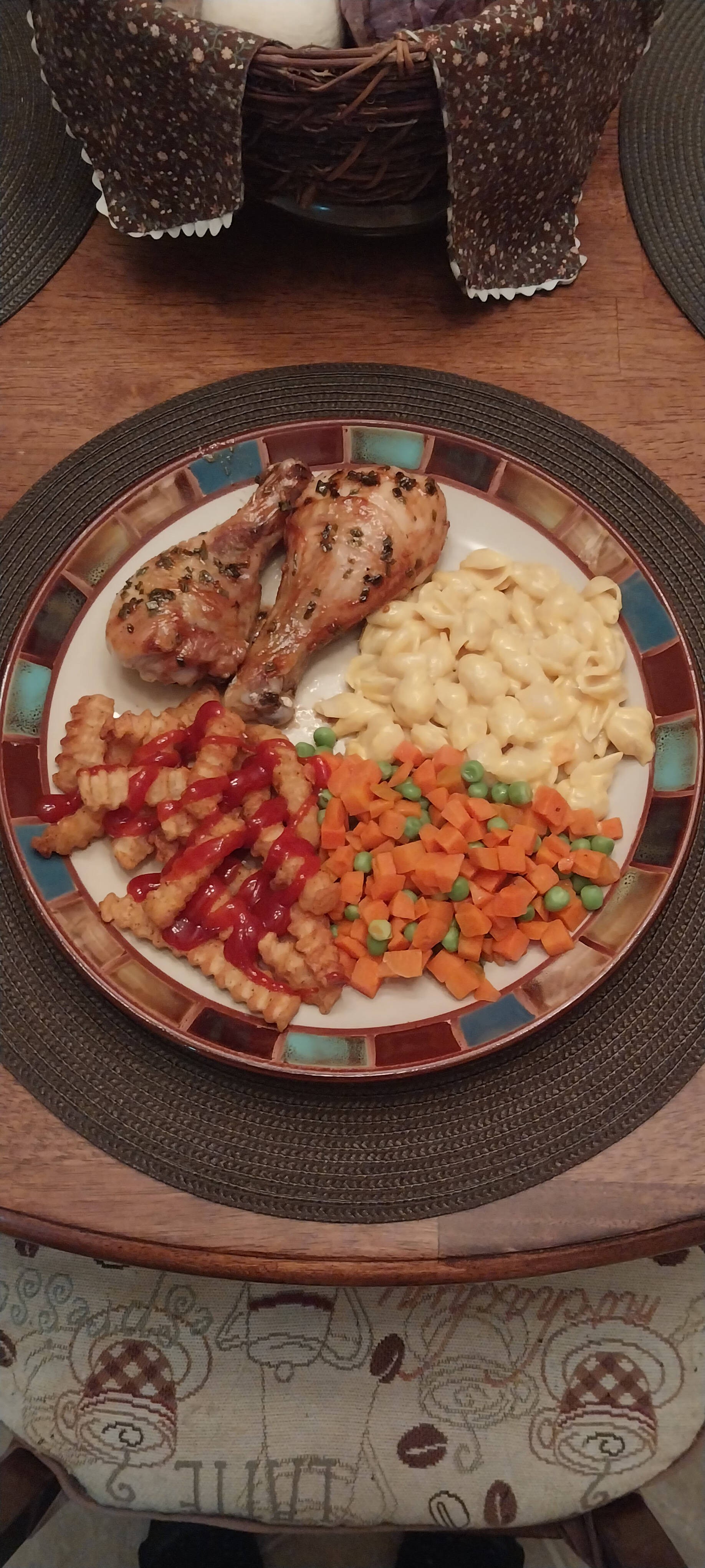 Everything is from scratch. Grass fed chicken I raised on a nature preserve in Costa Rica, hand-made pasta shells with cheese made from milk I milked from a cow, hand-cut crinkle fries from potatoes and peas and carrots I grew in a greehouse for a university agriculture project.